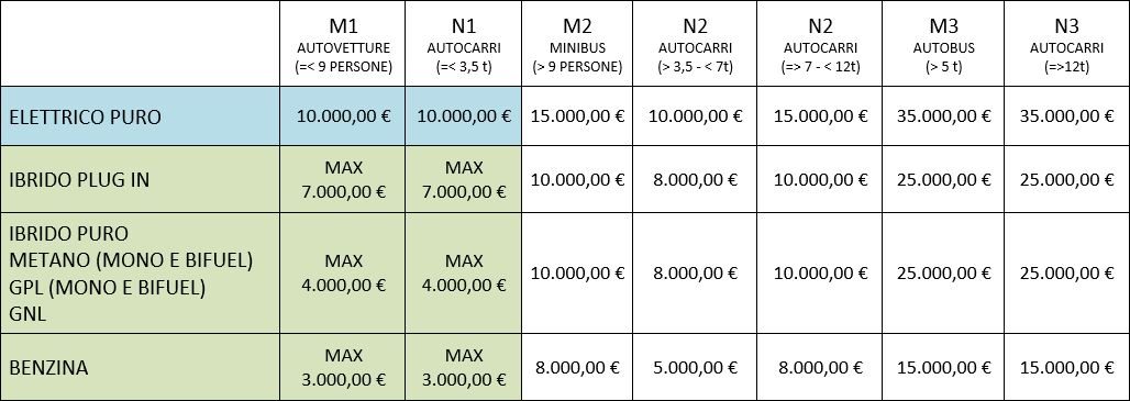 Il contributo viene erogato in base alla motorizzazione, alla massa a pieno carico e, per quanto riguarda le categorie di veicoli M1 (autovetture) e N1 (autocarri), alle emissioni prodotte.