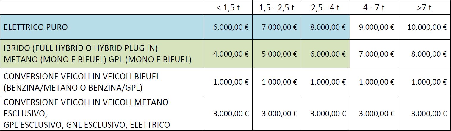 Il contributo viene erogato in base alla motorizzazione ed alla massa a pieno carico come riportato in tabella: