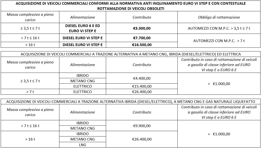 imprese di autotrasporto merci conto terzi un contributo a fondo perduto finalizzato ad incentivare l’acquisto di automezzi, anche Diesel di ultima generazione di classe EURO VI step E, rimorchi e semirimorchi, per l’adeguamento ed il rinnovo del parco veicolare, anche attraverso la rottamazione di veicoli obsoleti.